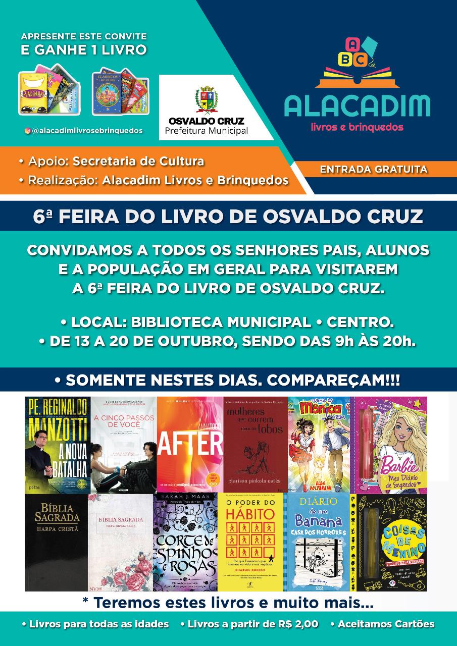 A realização é da “Alacadin Livros e Brinquedos” e têm apoio da Secretaria de Cultura, Esporte e Turismo de Osvaldo Cruz.