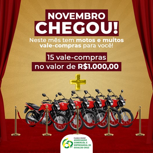Até o dia do sorteio, as lojas participantes vão distribuir cupons aos clientes, que depois vão concorrer a seis motos zero quilômetro e mais R$ 15 mil em vales compras aos consumidores (15 vales compras de R$ 1 mil cada).