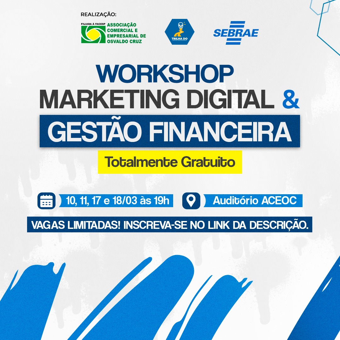 A Associação Comercial e Empresarial de Osvaldo Cruz, por meio da Trilha do Empreendedorismo, em parceria com o SEBRAE, promove o workshop gratuito “Marketing Digital e Gestão Financeira”, oferecendo capacitação estratégica para empresários e empreendedores que desejam aprimorar suas habilidades nessas áreas fundamentais para o sucesso dos negócios.