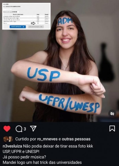 Com notas impressionantes, Maria Luiza garantiu sua vaga nos cursos de Administração de Empresas da Universidade de São Paulo (USP), campus Ribeirão Preto; da Universidade Federal de Curitiba (UFPR); e da Universidade Estadual Paulista (Unesp), campus Tupã.