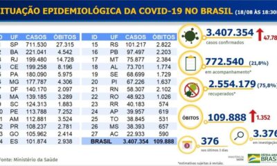 O Brasil alcançou 109.888 mortes e 3.407.354 casos confirmados de Covid-19 nesta terça-feira. As informações foram atualizadas pelo Ministério da Saúde. Nas últimas 24 horas, de...