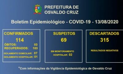 OSVALDO CRUZ – O número de infectados pelo novo coronavírus, em Osvaldo Cruz, foi de 111 para 114 desde o último levantamento divulgado na quarta-feira (12)....