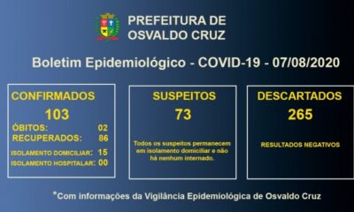 A Prefeitura de Osvaldo Cruz divulgou Boletim Epidemiológico sobre o novo Coronavírus na tarde desta sexta-feira (07), que mostra que o município registra 103 casos positivos...