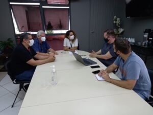 Na foto, a partir da esquerda, Ezequiel Santos, diretor da Divisão de Vigilância Epidemiológica, o secretário de Saúde e vice-prefeito Orlando Costa Dias, a prefeita Suéllen Rosim, o secretário de Negócios Jurídicos, Gustavo Bugalho, e o chefe de Gabinete da prefeitura Patric Teixeira, em reunião na tarde deste domingo (foto: Thiago Navarro/Prefeitura de Bauru)