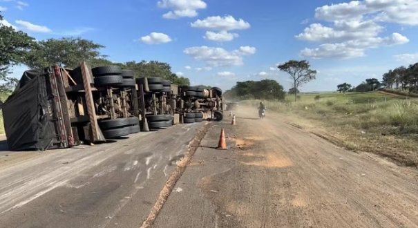 Ainda conforme a corporação, a carreta foi destombada e está fora da pista. Além disso, a carga está aguardando o transbordo.