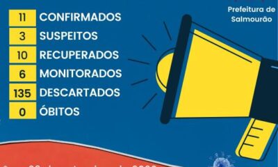 A Vigilância Epidemiológica de Salmourão informou na manhã desta terça-feira (29) que a cidade soma 11 casos positivos da doença e não tem mortes pela Covid-19....