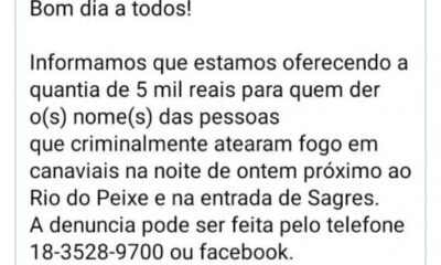 A Usina Califórnia de Parapuã ofereceu pelo Facebook uma recompensa de R$ 5 mil para quem tiver informações sobre autores de dois incêndios criminosos registrados neste...