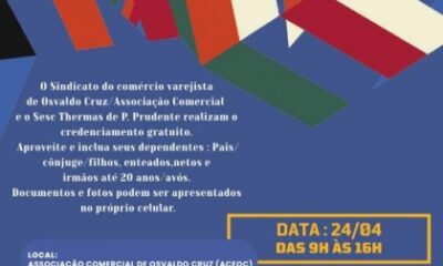 No dia 24 de abril, o SESC de Presidente Prudente, em parceria com a ACEOC e o Sincomércio, realizará emissão de credenciais do SESC gratuitamente! A...