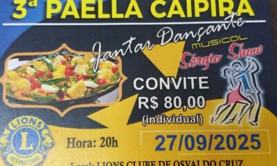 O Lions Clube de Osvaldo Cruz realizará no próximo dia 27 de setembro de 2025, a partir das 20h, a 3ª Paella Caipira, em um jantar dançante que promete muita...