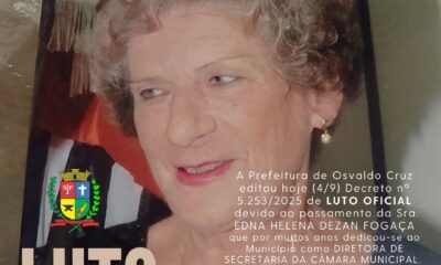 APrefeitura de Osvaldo Cruz editou hoje (4/9) Decreto nº 5.253/2025 de LUTO OFICIAL devido ao passamento da Sra. EDNA HELENA DEZAN FOGAÇA que por muitos anos...