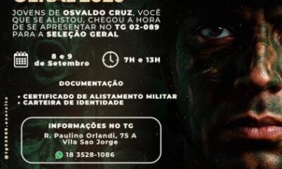 Hoje (8) e amanhã (9) o Tiro de Guerra (TG) de Osvaldo Cruz realiza o processo de Seleção Geral para os alistados de janeiro à junho...