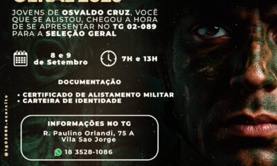Nos dias 08 e 09 de setembro, segunda e terça-feira, respectivamente, o Tiro de Guerra (TG) de Osvaldo Cruz realizará os trabalhos do processo de Seleção...