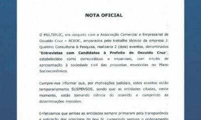 A Justiça Eleitoral suspendeu na manhã desta quinta-feira (15), a realização de entrevistas com os candidatos a prefeito de Osvaldo Cruz pelo Multiplic (Fórum de Desenvolvimento...