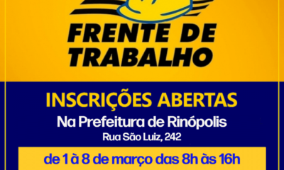 A Prefeitura de Rinópolis abre 20 vagas para o Programa Emergencial Auxílio Desemprego (Frente de Trabalho). As inscrições poderão ser realizadas de 1 a 8 de...