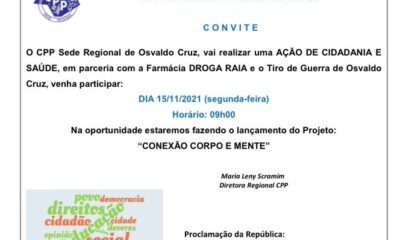 O CPP (Centro do Professorado Paulista) sede regional de Osvaldo Cruz vai realizar uma ação de cidadania e saúde, em parceria com o Tiro de Guerra...