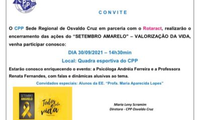 O CPP (Centro do Professorado Paulista) e o Rotaract de Osvaldo Cruz realizam nesta quinta-feira (30), o encerramento das ações da campanha ‘Setembro Amarelo’. O evento...