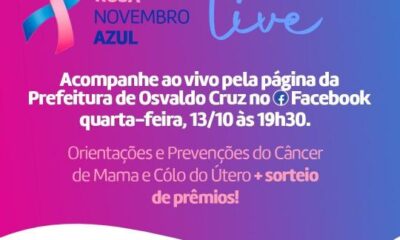 A Prefeitura de Osvaldo Cruz, através da Secretaria Municipal de Saúde, convida toda população para participar da Live em homenagem ao Outubro Rosa. A transmissão será...