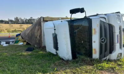 Um caminhão carregado com uma carga de mais de 25 toneladas de sal tombou nesta quarta-feira (28), na Rodovia Assis Chateaubriand (SP-425), em Regente Feijó (SP)....