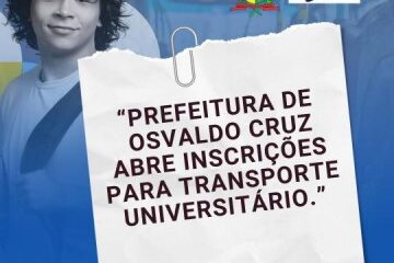 A Secretaria Municipal de Educação de Osvaldo Cruz informa que abre inscrições para o Transporte Universitário destinado aos alunos que iniciarão cursos de graduação ou técnico...