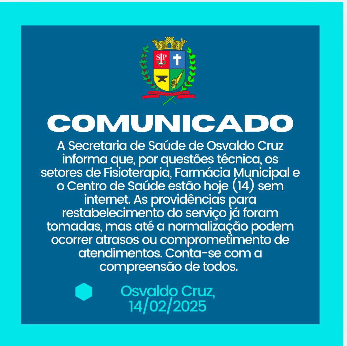 A Secretaria de Saúde de Osvaldo Cruz informa que, por questões técnica, os setores de Fisioterapia, Farmácia Municipal e o Centro de Saúde estão hoje (14) sem internet.