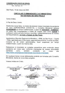 A decisão segue as normas estipuladas pela Secretaria de Saúde do Estado, que também suspendeu as aulas na Rede Estadual de Ensino, teatros, cinemas e outros eventos com grandes aglomerações. Assim, a Congregação Cristã no Brasil é a primeira instituição evangélica a suspender seus cultos no estado de São Paulo, em uma medida preventiva no combate ao avanço do novo coronavírus (Covid-19).