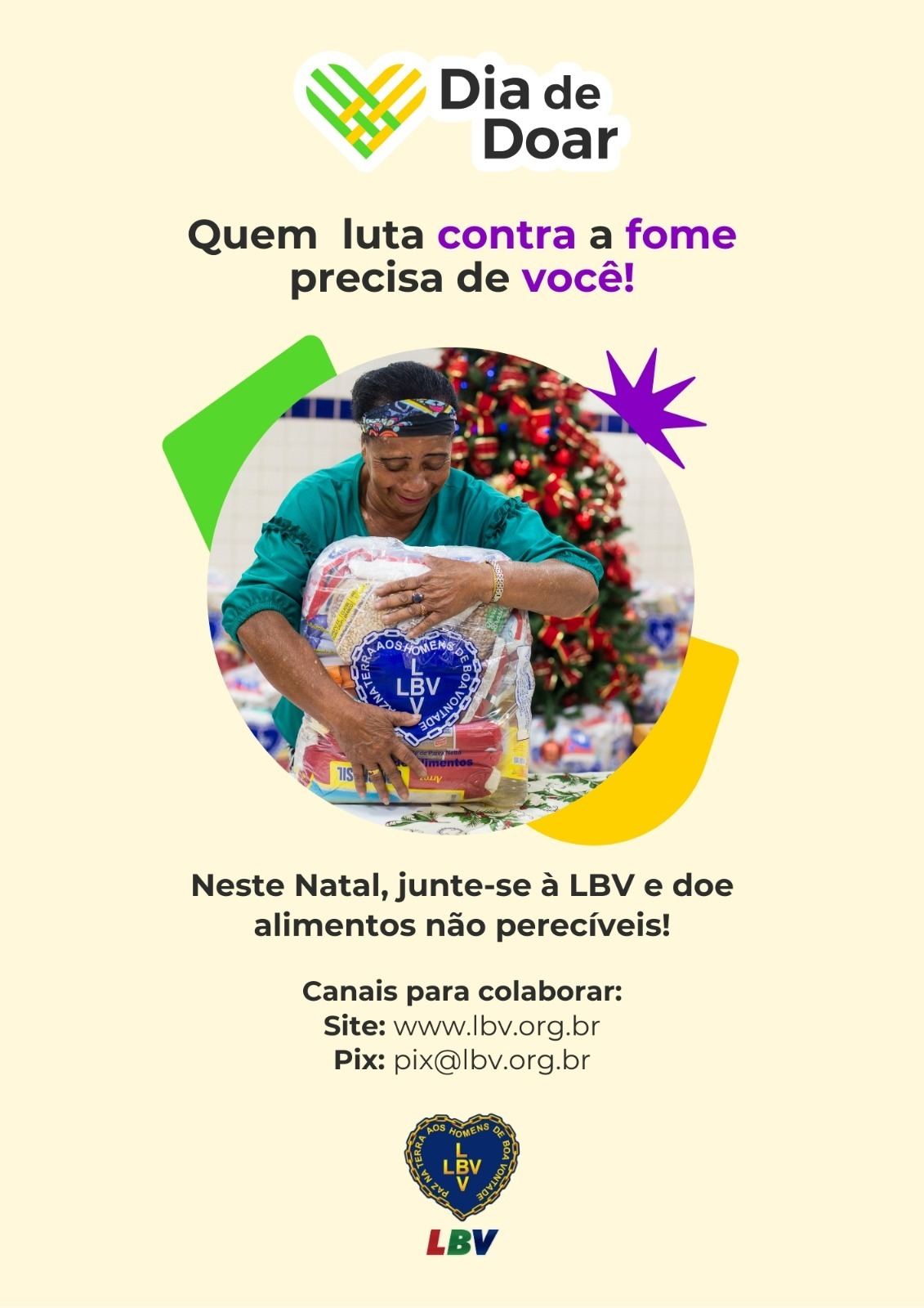A Legião da Boa Vontade também participa deste movimento por meio de sua campanha de mobilização social Natal Permanente da LBV — Jesus, o Pão Nosso de cada dia! visando arrecadar alimentos não perecíveis para compor as mais de 40 mil cestas que serão entregues a famílias que vivem em situação de vulnerabilidade social em mais de 200 municípios do país. O objetivo é proporcionar um Natal digno e sem fome a milhares de famílias atendidas nos serviços e programas socioeducacionais da LBV e também as assistidas por organizações parceiras da Entidade.