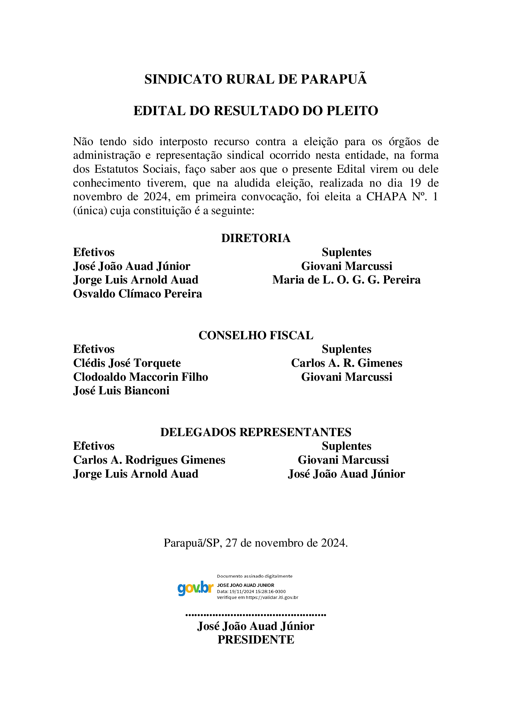 Edital do resultado da eleição do sindicato rural de Parapuã