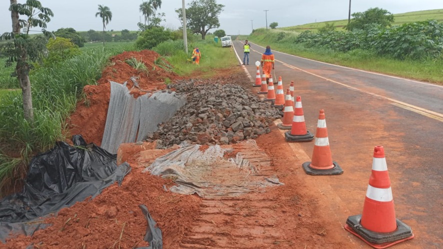 Reparos emergenciais da SPA 571, ligação da SP-294 – Rodovia Comandante João Ribeiro de Barros entre Salmourão e Osvaldo Cruz, mobilizam nesta quinta-feira, 3, equipes de Conserva da regional de Dracena corrigem trecho de pista prejudicado pelas chuvas.