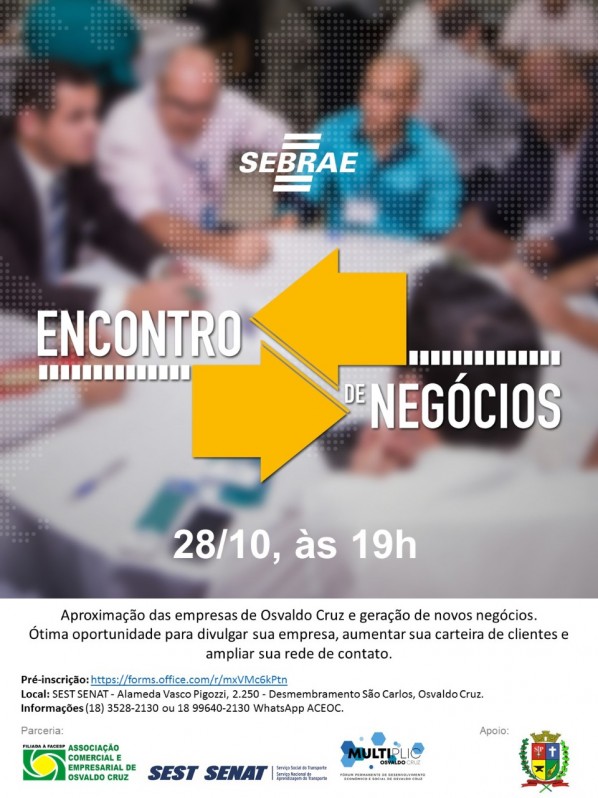 O Sebrae (Serviço Brasileiro de Apoio às Micro e Pequenas Empresas) está com inscrições gratuitas abertas para o Encontro de Negócios que será realizado no dia 28 de outubro, às 19h, em Osvaldo Cruz.