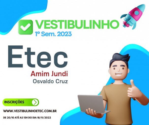 Inscrições eletrônicas pelo portal www.vestibulinhoetec.com.br no período de 20/10 até as 15h do dia 18/11/2022. Para quem não tem acesso à internet, a escola dispõe de um posto de inscrição na própria unidade.