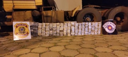 Ao realizar abordagem e vistoria, a equipe localizou 224 tabletes de cocaína escondidos dentro de um fundo falso sobre a quinta roda do veículo.