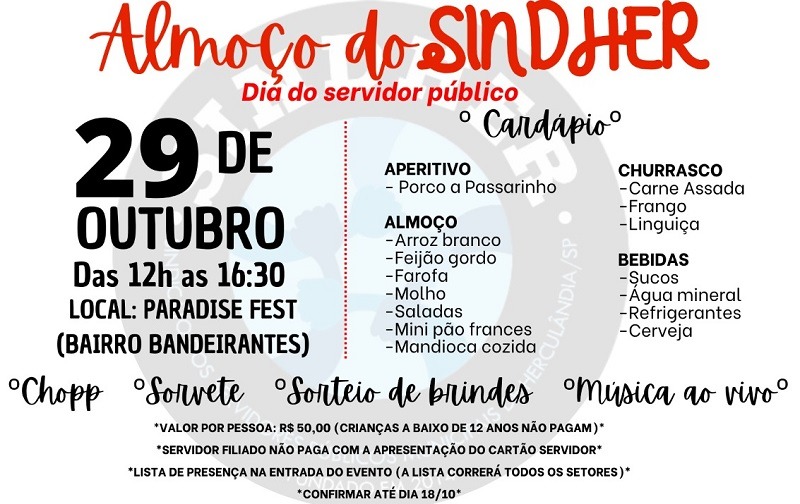 O Sindicato dos Servidores Municipais de Herculândia (Sindher) recebe até esta quarta-feira, 26/10, as adesões de servidores (sócios ou não) interessados em participar do evento de confraternização pelo dia da categoria, que oficialmente se celebra na sexta-feira, dia 28.