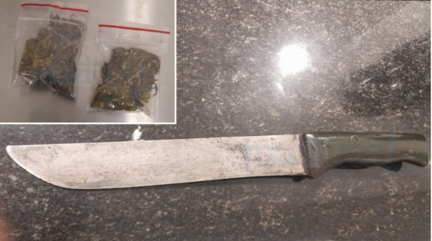 Ao chegar ao local, os policiais se depararam com um homem em estado visivelmente alterado, proferindo palavras desconexas. Durante a abordagem, foram encontradas com o indivíduo duas porções embaladas de maconha. Além disso, a equipe localizou o facão, que teria sido utilizado para cometer as agressões.