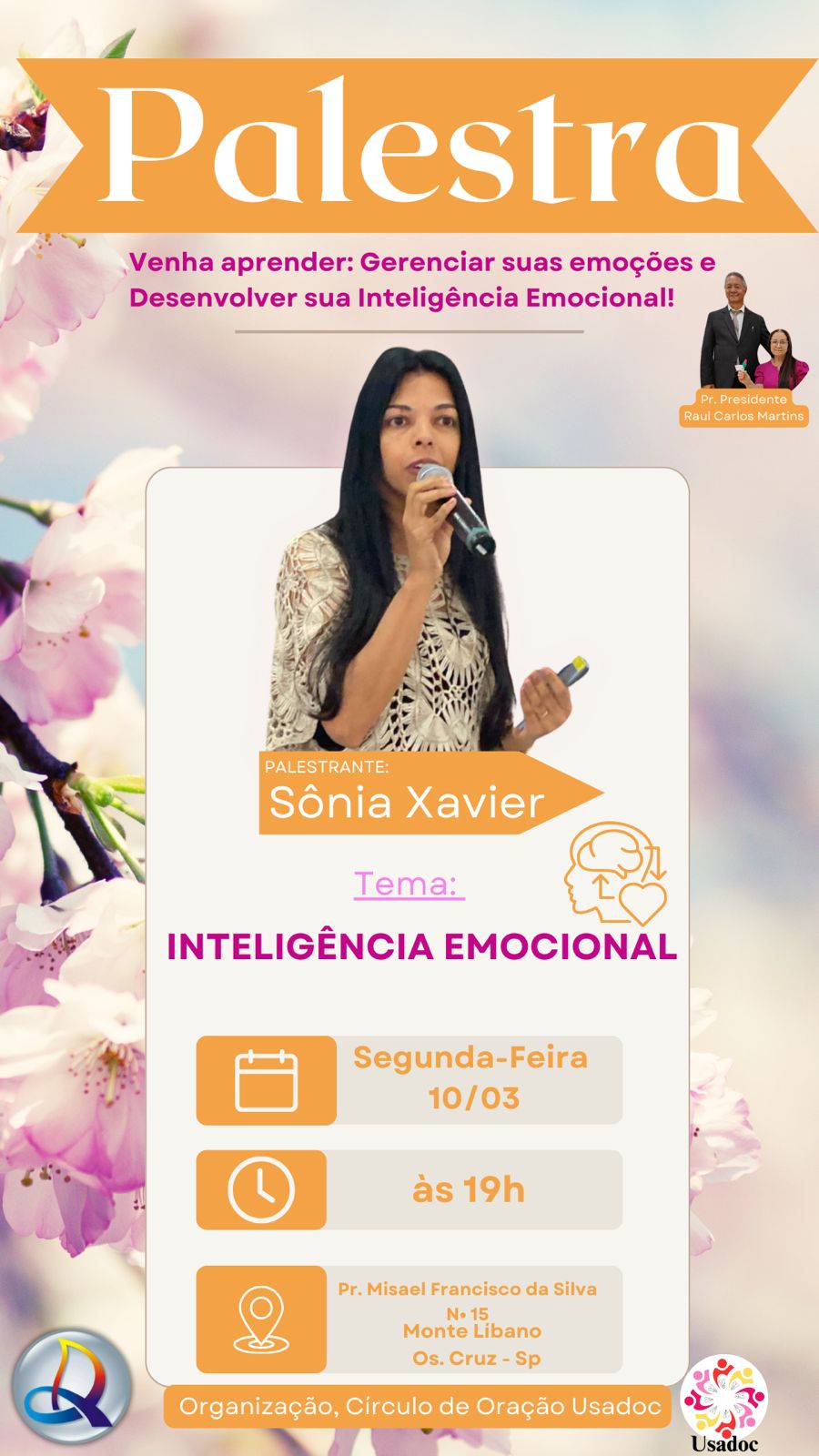 O Círculo de Oração e a Usadoc da Igreja Assembleia de Deus – Ministério Belém Osvaldo Cruz realizam na próxima segunda-feira, dia 10 de março, às 19 horas, na Congregação do Monte Líbano, uma palestra especial com o tema “Inteligência Emocional”.