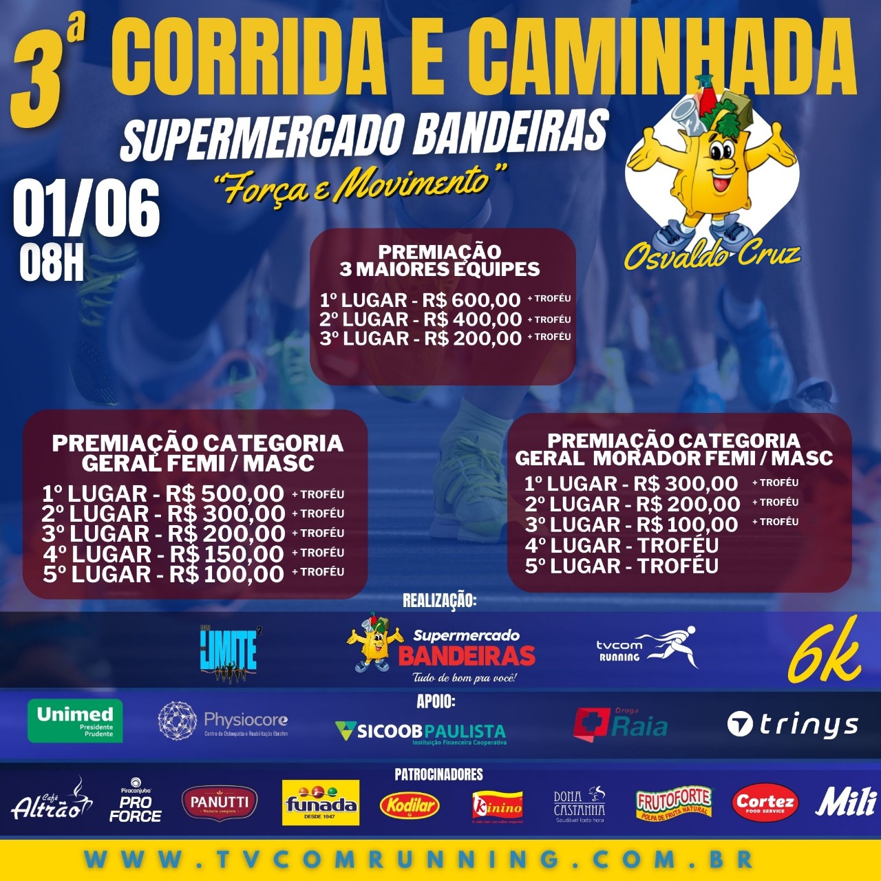 Além das premiações, a Corrida e Caminhada Supermercado Bandeiras é uma excelente oportunidade para reunir amigos e familiares em um momento de saúde, bem-estar e muita vibração positiva. Prepare seu tênis, convide a galera e participe dessa festa esportiva que já virou tradição em Osvaldo Cruz!