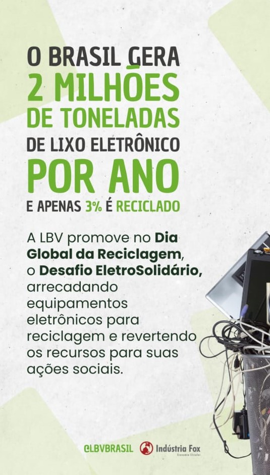 O Brasil gera 2 milhões de toneladas de lixo eletrônico por ano e somente 3% desse material é reciclado. Para contribuir com a mudança desse cenário, a Legião da Boa Vontade (LBV) aderiu ao Dia Global da Reciclagem (18 de março) e está promovendo a campanha Desafio EletroSolidário para arrecadar equipamentos eletrônicos e eletrodomésticos em desuso ou que iriam para o lixo. A reciclagem será feita pela Indústria Fox, especializada no descarte sustentável que reverterá os itens arrecadados em recursos para as ações sociais da LBV.