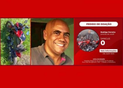 Os familiares de Rodrigo Ferreira, de 51 anos, pedem doação de sangue com urgência após ele sofrer um grave acidente de moto.
