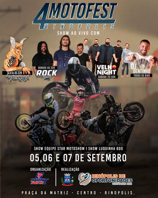 Depois de sete anos de pausa, o tradicional MotoFest de Rinópolis está de volta em grande estilo! A 4ª edição do evento acontece nos dias 05, 06 e 07 de setembro, na Praça da Matriz, e promete movimentar a cidade com muita música, adrenalina e cultura sobre duas rodas.