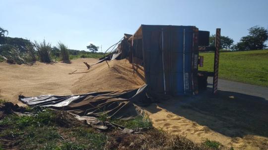 O caminhão Scânia carregado com farelo de soja transitava pela Rodovia Assis Chateaubriand (SP-425) e ao pegar o acesso no “trevão” com a SP-294, sentido a Tupã, o motorista perdeu o controle da direção e tombou.