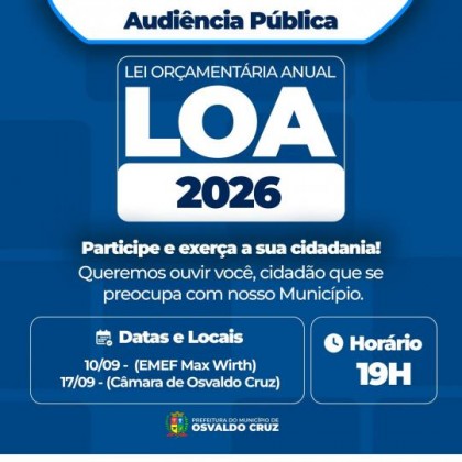 A Prefeitura de Osvaldo Cruz convida cidadãos em geral para participarem de audiências públicas referentes à elaboração da Lei Orçamentária Anual (LOA) de 2026.
