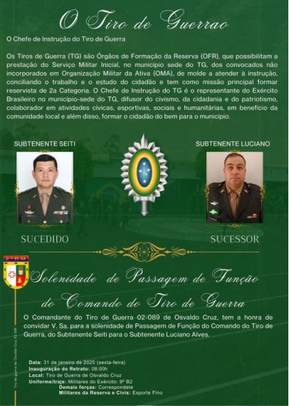 O Tiro de Guerra de Osvaldo Cruz convida à população para a Solenidade de Passagem de Função do Comando do Tiro de Guerra do Subtenente Seiti para o Subtentente Luciano Alves no dia 31 de janeiro, sexta-feira, a partir das 08h no próprio TG de Osvaldo Cruz.