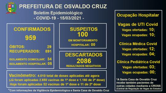 O município de Osvaldo Cruz confirmou nesta segunda-feira, 15, que tem 959 casos positivos da Covid-19. Na sexta-feira (12) eram 952. Os óbitos permanecem em 29.