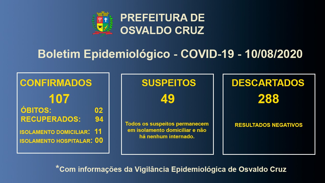 A semana começou com a confirmação de quatro novos casos de coronavírus em Osvaldo Cruz. Com isso, o boletim epidemiológico da Prefeitura aponta para 107 positivos para a doença.