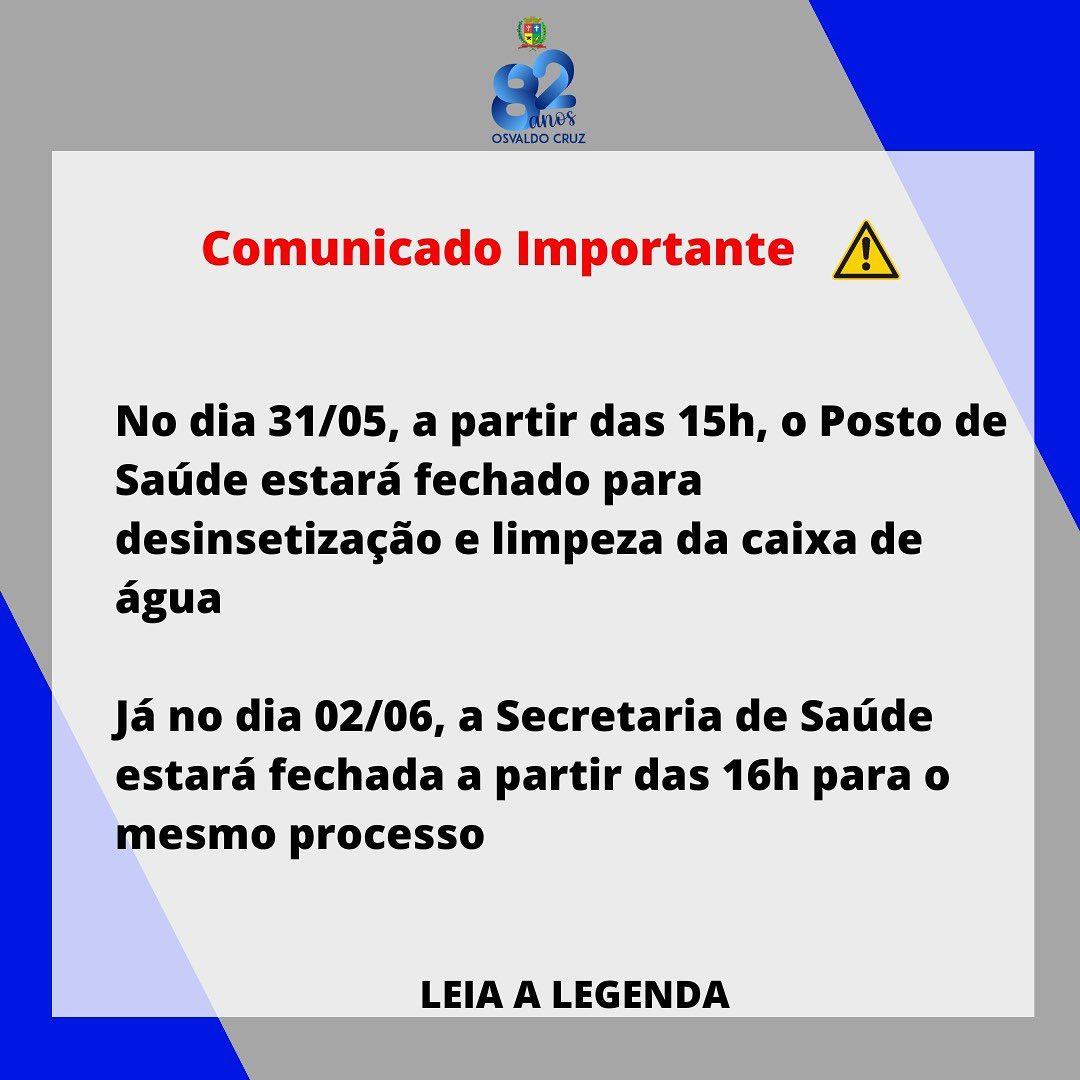 No dia 31/05, a partir das 15h, o Posto de Saúde estará fechado para desinsetização e limpeza da caixa de água. Essa medida é essencial para garantir um ambiente saudável e seguro para todos.