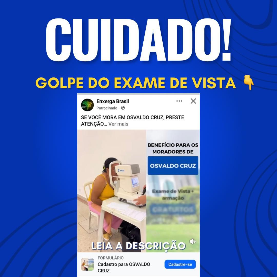 Um perfil denominado Enxerga Brasil publicou anúncio falso de que em Osvaldo Cruz estariam sendo oferecidos exames oftalmológicos e armações de óculos de graça.