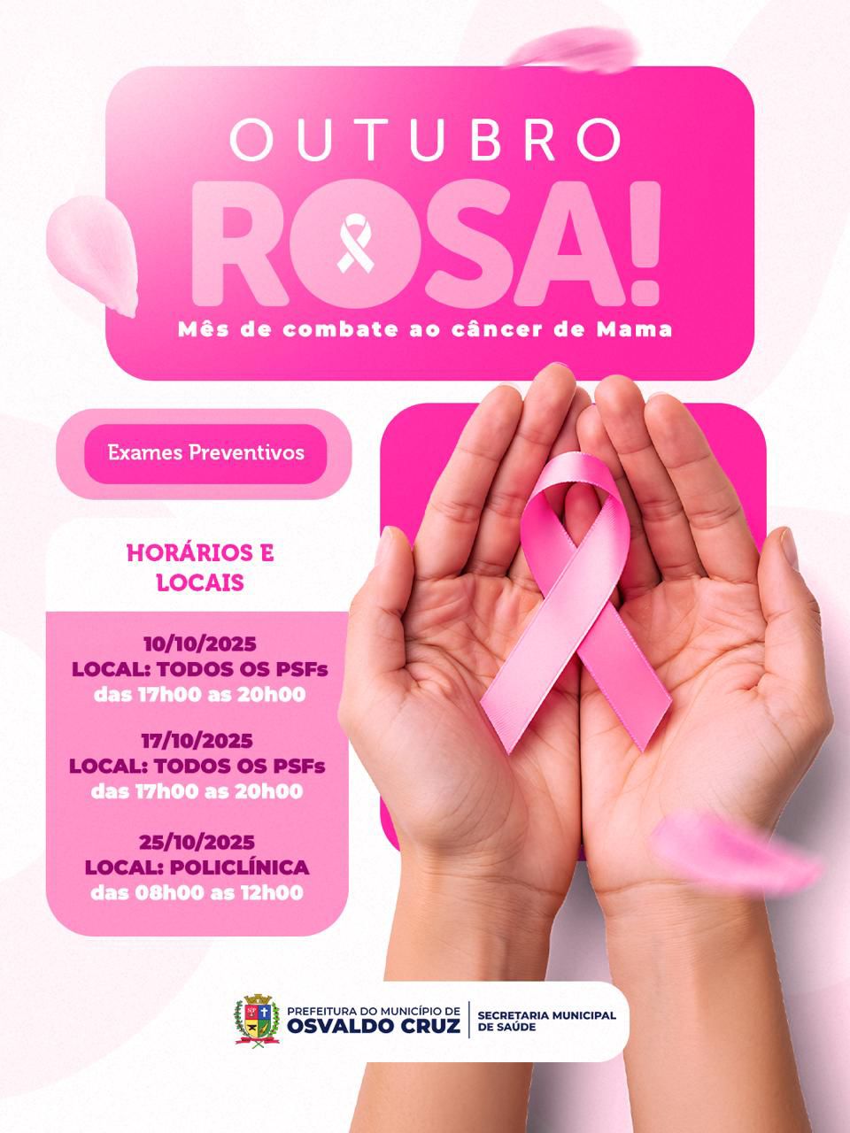 A Prefeitura de Osvaldo Cruz, por meio da Secretaria Municipal de Saúde, realiza neste mês uma série de ações voltadas à conscientização e à prevenção do câncer de mama, dentro da campanha Outubro Rosa — movimento mundial que reforça a importância do diagnóstico precoce para salvar vidas.