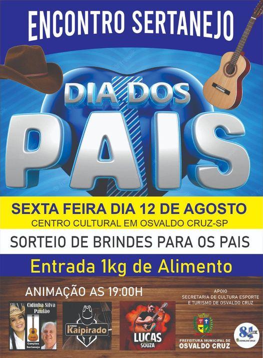 No dia 12 de agosto (sexta-feira), a Prefeitura de Osvaldo Cruz, através da Secretaria Municipal de Cultura, Esportes e Turismo irá realizar o evento “Encontro Sertanejo Dia dos Pais Solidário” em comemoração ao Dia dos Pais.