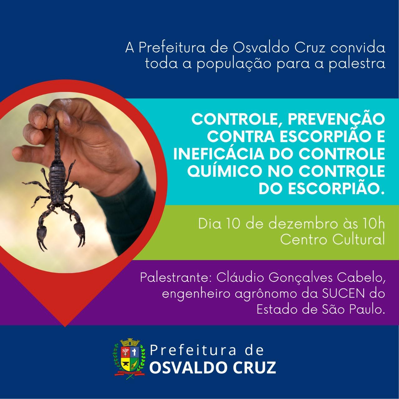A Prefeitura de Osvaldo Cruz convida toda população para participar de uma importante palestra, que irá abordar o controle, a prevenção contra Escorpião e a ineficácia do uso de produtos químicos no controle do Escorpião.