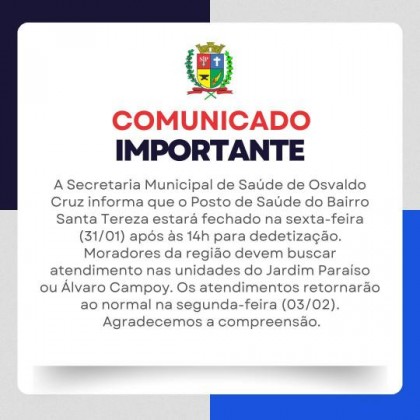 A Secretaria Municipal de Saúde da Prefeitura de Osvaldo Cruz informa que o Posto de Saúde do Bairro Santa Tereza não funcionará nesta sexta-feira (31/01) após às 14 horas, devido à necessidade de dedetização do prédio.
