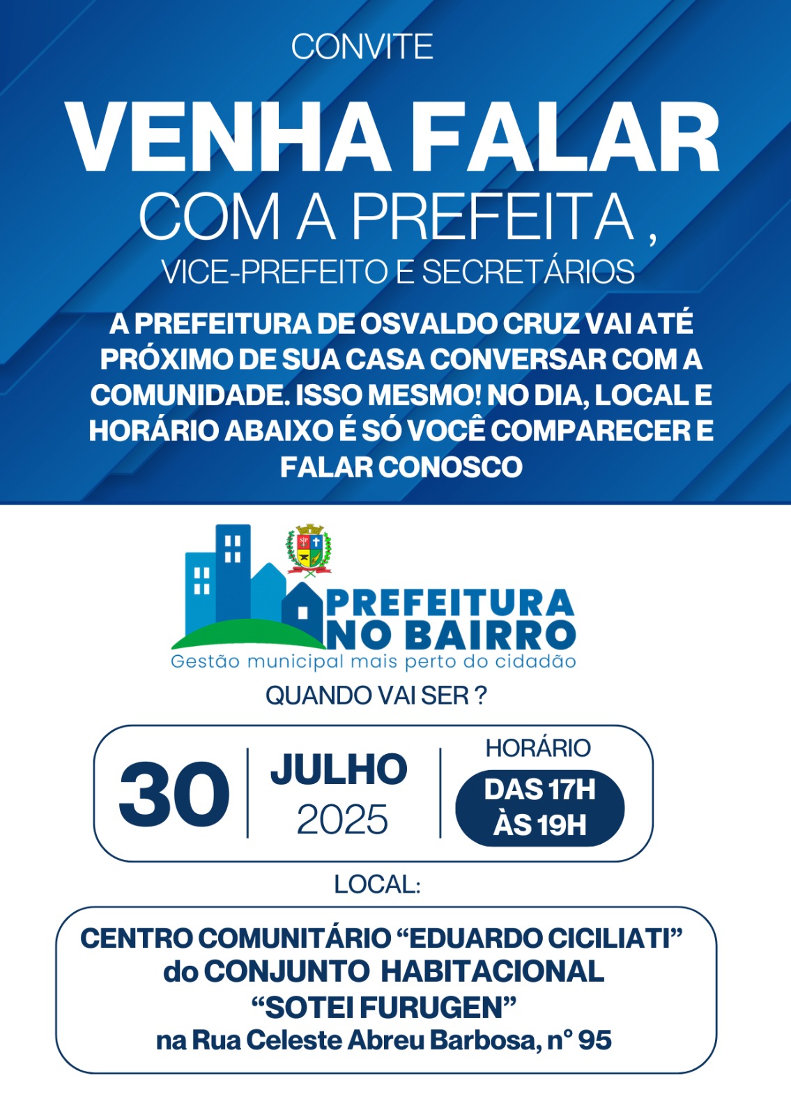 A Prefeitura de Osvaldo Cruz realiza nesta quarta-feira, 30, a segunda edição do programa “Prefeitura no Bairro”.